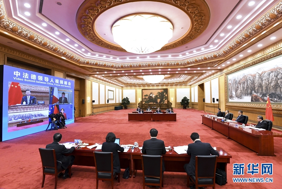 4月16日下午,国家主席习近平在北京同法国总统马克龙、德国总理默克尔举行中法德领导人视频峰会。三国领导人就合作应对气候变化、中欧关系、抗疫合作以及重大国际和地区问题深入交换意见。