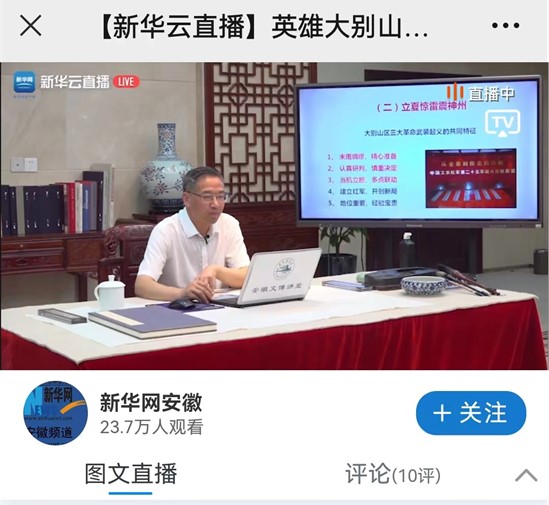 该讲座由安徽博物院主办,新华网进行直播。16日19时,讲座正式开始。首先由博物院的讲解员带领观众观看了一些与大别山红色历史有关的革命文物并了解其背后的故事,一起追忆了大别山区“28年红旗不倒”的光辉历史。