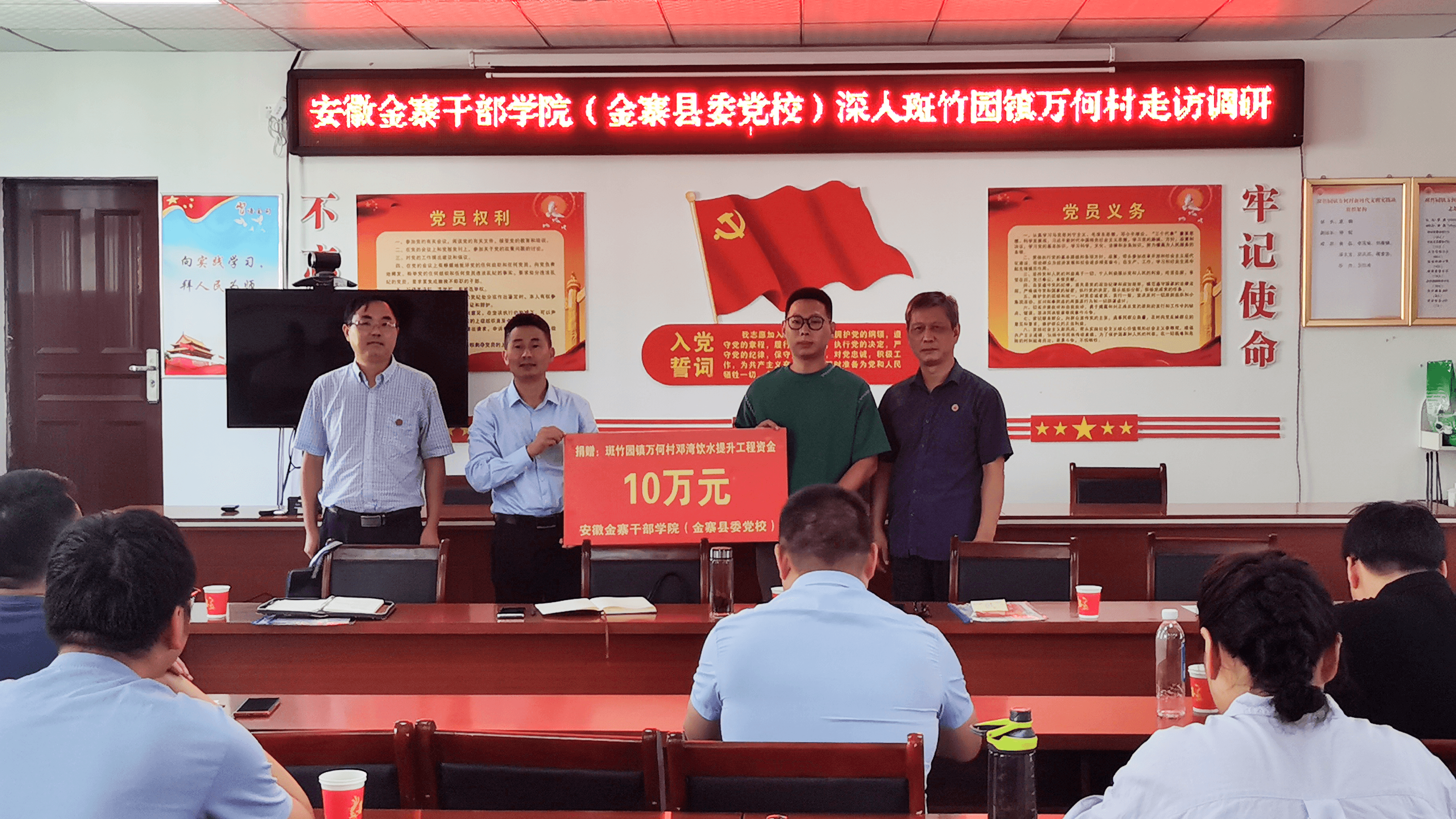在万何村党员活动室,查德金一行与村“两委”干部、驻村工作队召开座谈会,听取了该村近期工作情况特别是抗旱保苗保水工作情况汇报,详细了解该村人畜饮水、生产灌溉等群众生产生活状况。万何村由于地势较高,今年旱情较重,邓湾等少数居民组人畜饮水存在一定困难,为解决群众“急难愁盼”问题,持续巩固拓展脱贫攻坚成果,安徽金寨干部学院向万何村捐赠10万元,为邓湾组新建1座高标准蓄水池和1座过滤池,改造1公里输水管道,进一步提升群众饮水安全保障。