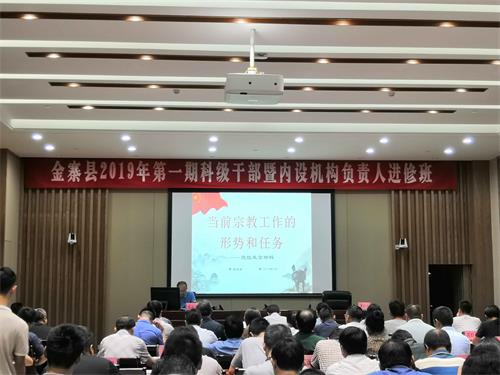 8月9日,金寨县委统战部副部长、民宗局局长张远金在金寨县委党校金东苑405教室给金寨县2019年第一期科级干部进修班讲授《做好新形势下的宗教工作》课程。