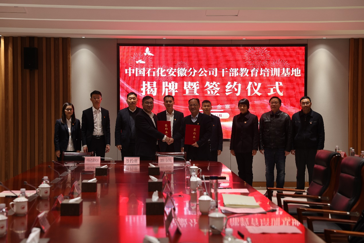 12月4日,中国石化安徽石油干部教育培训基地揭牌签约仪式在安徽金寨干部学院举行。安徽石油党委副书记、纪委书记、工会主席李海燕,党群工作部部长阮德胜,六安公司党委书记、总经理阚晓斌和金寨县委常委、安徽金寨干部学院(县委党校)常务副院(校)长查德金,副院(校)长吴继彩出席揭牌签约仪式。李海燕和查德金共同为干部教育培训基地揭牌,阮德胜和安徽金寨干部学院院(校)委委员余微代表双方签订《中国石化安徽石油分公司干部教育培训基地共建框架协议书》。