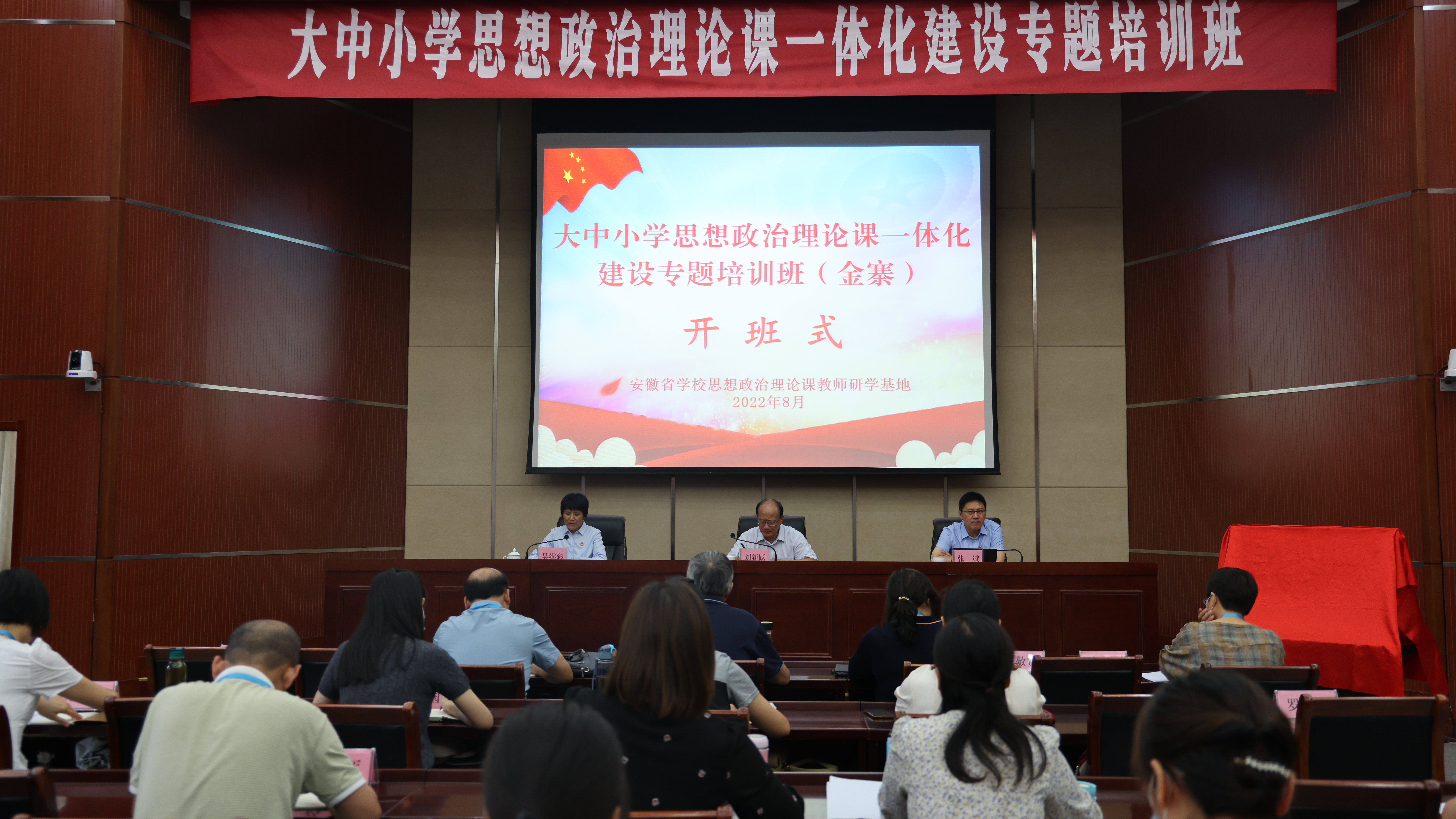 8月27日上午,由安徽财经大学主办的大中小学思想政治理论课一体化建设专题培训班在安徽金寨干部学院开班,安徽财经大学马克思主义学院党总支书记、院长张斌主持了开班式暨安徽财经大学新时代思政课教师研学基地揭牌仪式。安徽省大中小学思想政治理论课一体化建设专家组组长刘新跃、安徽金寨干部学院副院长吴继彩出席了仪式,大中小学思想政治理论课一体化建设专题培训班全体学员和安徽金寨干部学院部分教师代表参加了仪式。