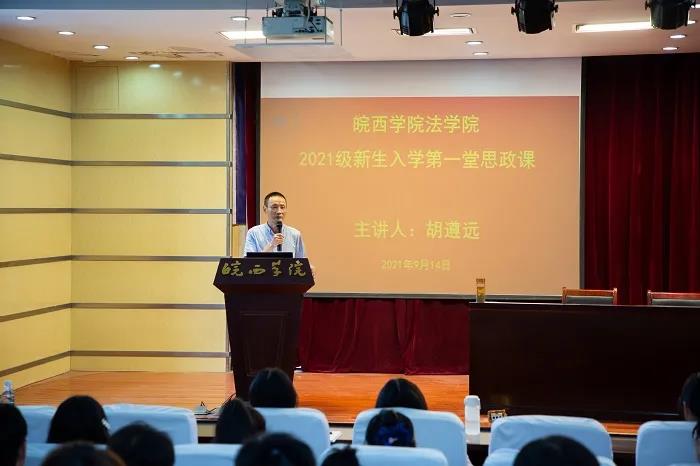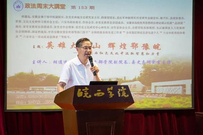 红色基因是矢志不渝的信仰,是爱党爱国的忠诚,是自强不息的追求,是无私奉献的担当。因此,要把红色基因融入师生血脉,让红色基因代代相传,“把红色资源利用好、把红色传统发扬好、把红色基因传承好”,并使其转化为一种校园“内驱力”。作为皖西学院法学院2021级新生入学教育的重要内容之一,2021年9月14日下午,皖西学院法学院和皖西学院社科联邀请安徽金寨干部学院副院长,县党史和地方志研究室主任、档案馆馆长胡遵远做客皖西学院“政法周末大讲堂”第153期,以“英雄大别山 辉煌鄂豫皖——从皖西红色文化中汲取智慧和力量”为主题,给2021级新生上入学第一堂思政课。活动由法学院院长、校社科联副主席刘鑫主持,法学院党委副书记荣媛媛、辅导员姚德军、部分教师和21级全体新生参加了活动。