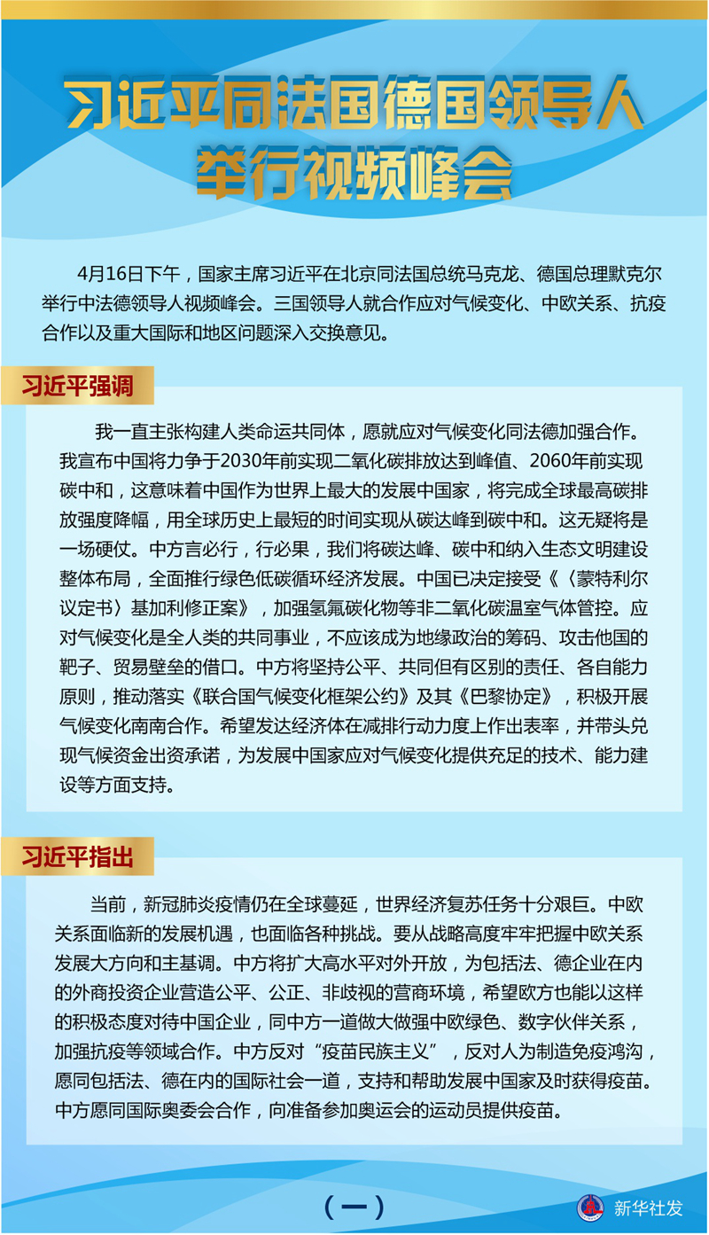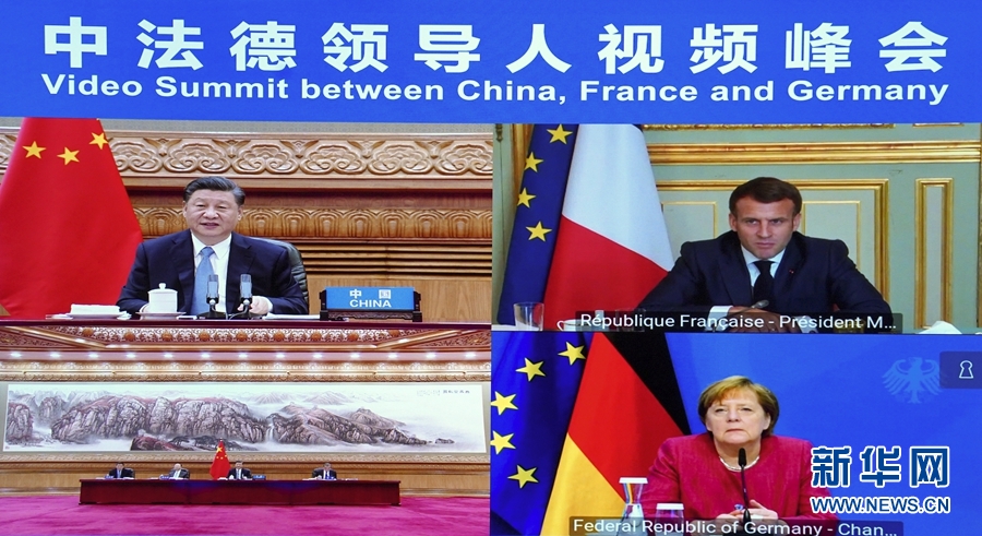 4月16日下午,国家主席习近平在北京同法国总统马克龙、德国总理默克尔举行中法德领导人视频峰会。三国领导人就合作应对气候变化、中欧关系、抗疫合作以及重大国际和地区问题深入交换意见。