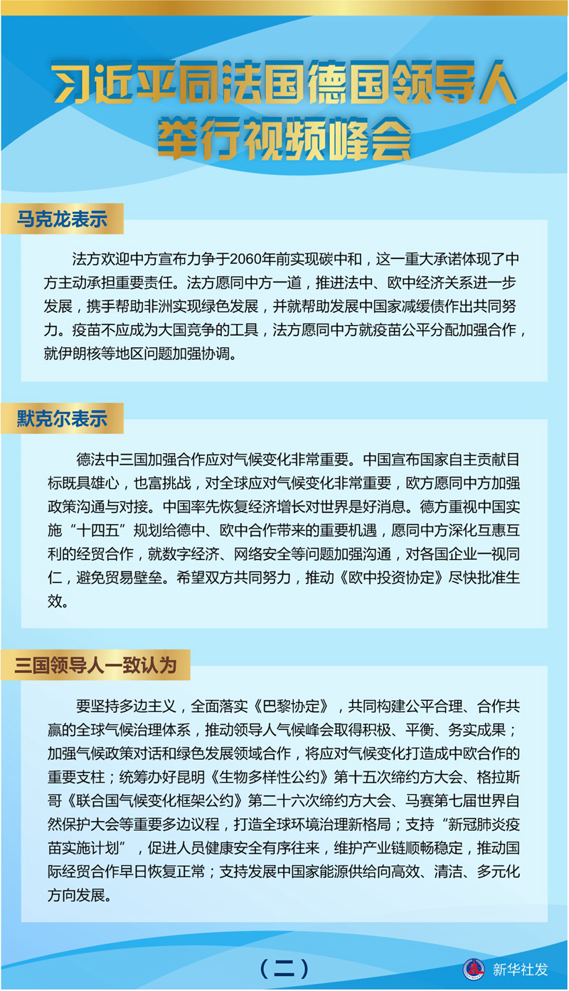 习近平指出,当前,新冠肺炎疫情仍在全球蔓延,世界经济复苏任务十分艰巨。中欧关系面临新的发展机遇,也面临各种挑战。要从战略高度牢牢把握中欧关系发展大方向和主基调。中方将扩大高水平对外开放,为包括法、德企业在内的外商投资企业营造公平、公正、非歧视的营商环境,希望欧方也能以这样的积极态度对待中国企业,同中方一道做大做强中欧绿色、数字伙伴关系,加强抗疫等领域合作。中方反对“疫苗民族主义”,反对人为制造免疫鸿沟,愿同包括法、德在内的国际社会一道,支持和帮助发展中国家及时获得疫苗。中方愿同国际奥委会合作,向准备参加奥运会的运动员提供疫苗。