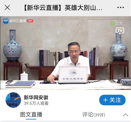 该讲座由安徽博物院主办,新华网进行直播。16日19时,讲座正式开始。首先由博物院的讲解员带领观众观看了一些与大别山红色历史有关的革命文物并了解其背后的故事,一起追忆了大别山区“28年红旗不倒”的光辉历史。