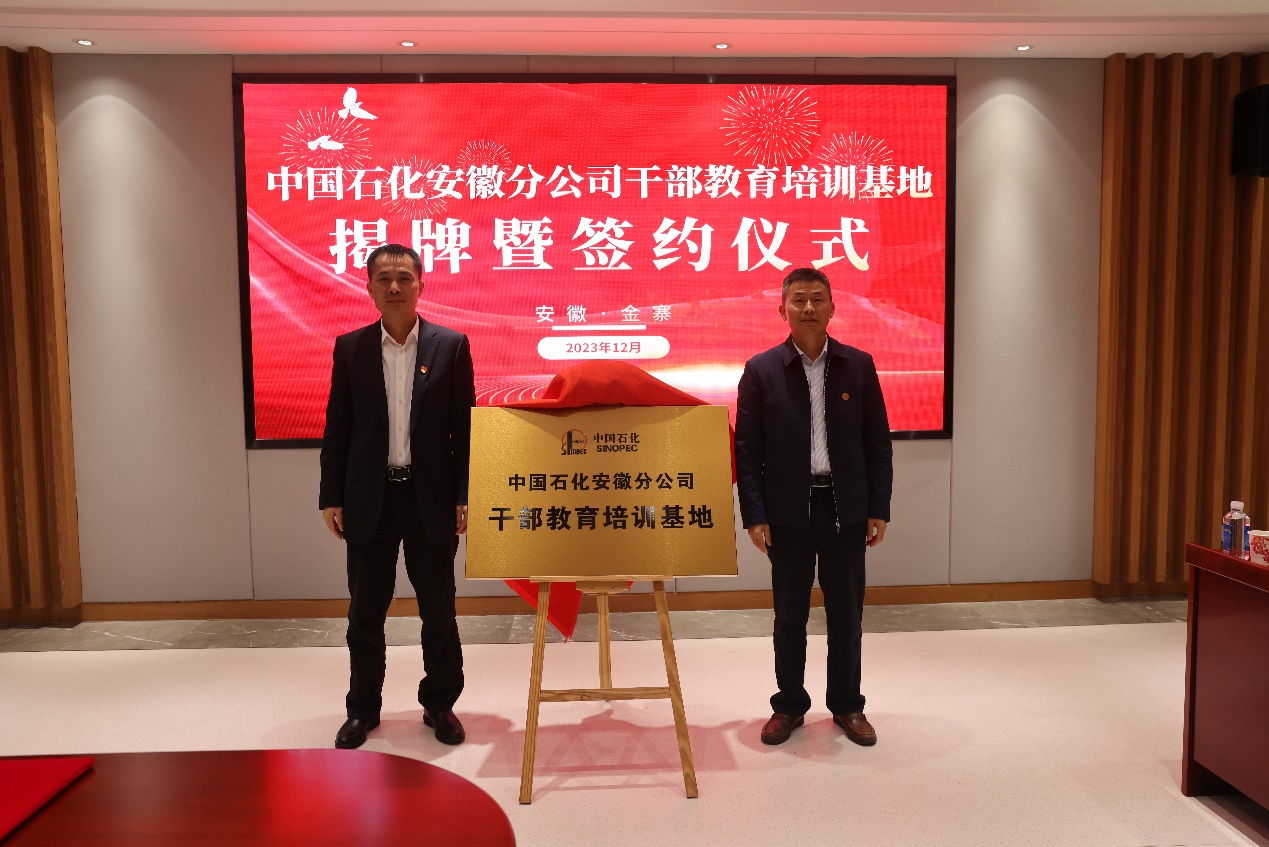 12月4日,中国石化安徽石油干部教育培训基地揭牌签约仪式在安徽金寨干部学院举行。安徽石油党委副书记、纪委书记、工会主席李海燕,党群工作部部长阮德胜,六安公司党委书记、总经理阚晓斌和金寨县委常委、安徽金寨干部学院(县委党校)常务副院(校)长查德金,副院(校)长吴继彩出席揭牌签约仪式。李海燕和查德金共同为干部教育培训基地揭牌,阮德胜和安徽金寨干部学院院(校)委委员余微代表双方签订《中国石化安徽石油分公司干部教育培训基地共建框架协议书》。
