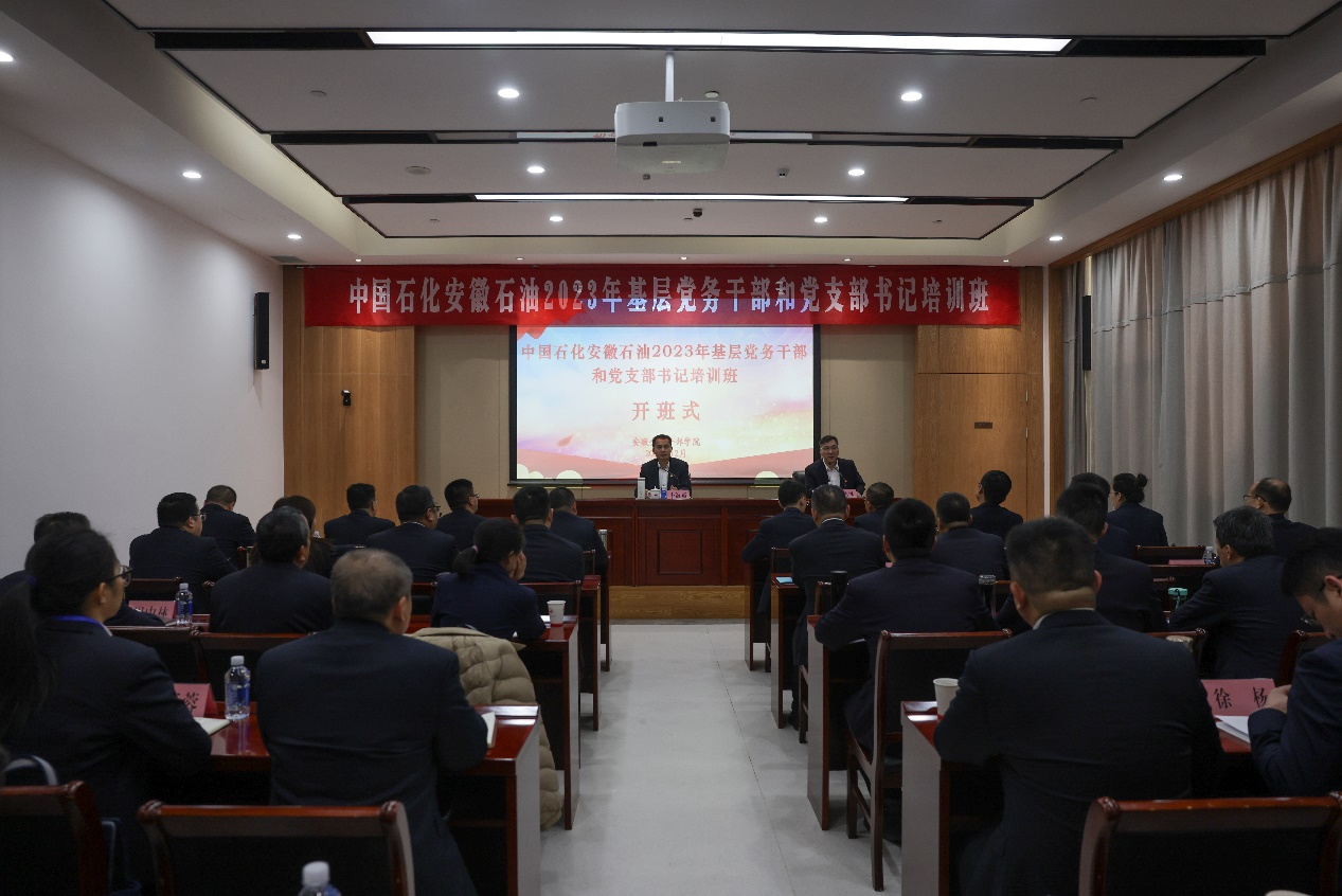 揭牌仪式后,在金东苑401教室举行了中国石化安徽石油2023年基层党务干部和党支部书记培训班开班式。此次培训,设置了《推进基层党建与生产经营相结合》《党支部工作务实和“三会一课”动漫演练》《怎样当好党支部书记》等课程。