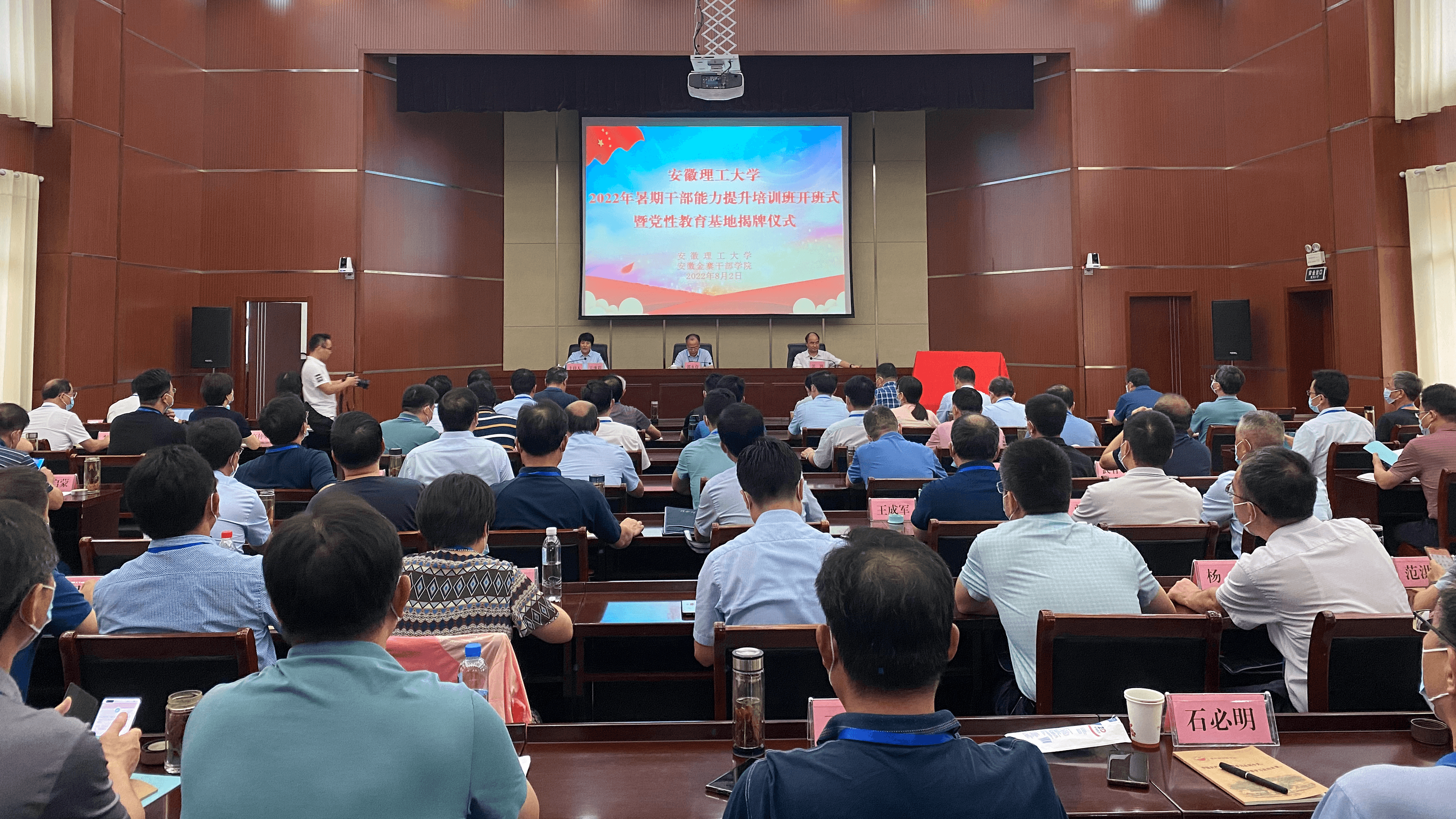 2022年 8月2日下午,安徽理工大学在安徽金寨干部学院举行党性教育基地揭牌仪式。安徽理工大学党委书记郭永存,中共金寨县委副书记、县长张涧出席揭牌仪式,仪式由安徽金寨干部学院(中共金寨县委党校)副院(校)长吴继彩主持,参加仪式的还有安徽理工大学的相关领导以及安徽金寨干部学院的教职工代表。