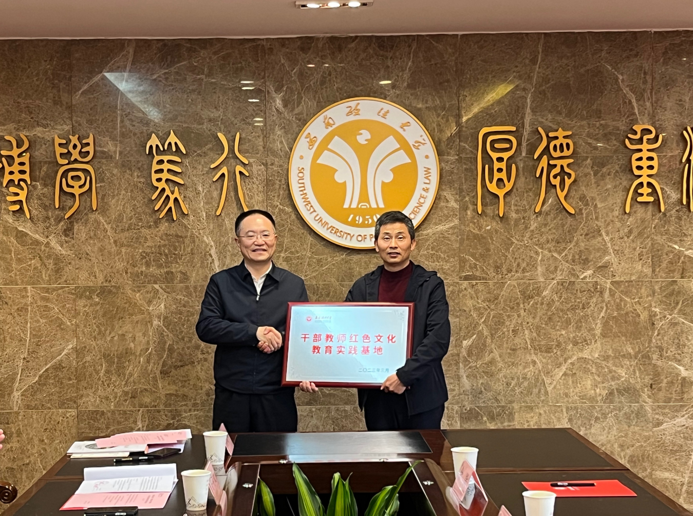 会上,西南政法大学党委副书记吴钰鸿代表西南政法大学为安徽金寨干部学院授牌,分别在安徽金寨干部学院设立“西南政法大学新时代思政课教师研学基地”和“西南政法大学干部教师红色文化教育实践基地”,与会人员就有关合作事项进行了充分交流和研讨。