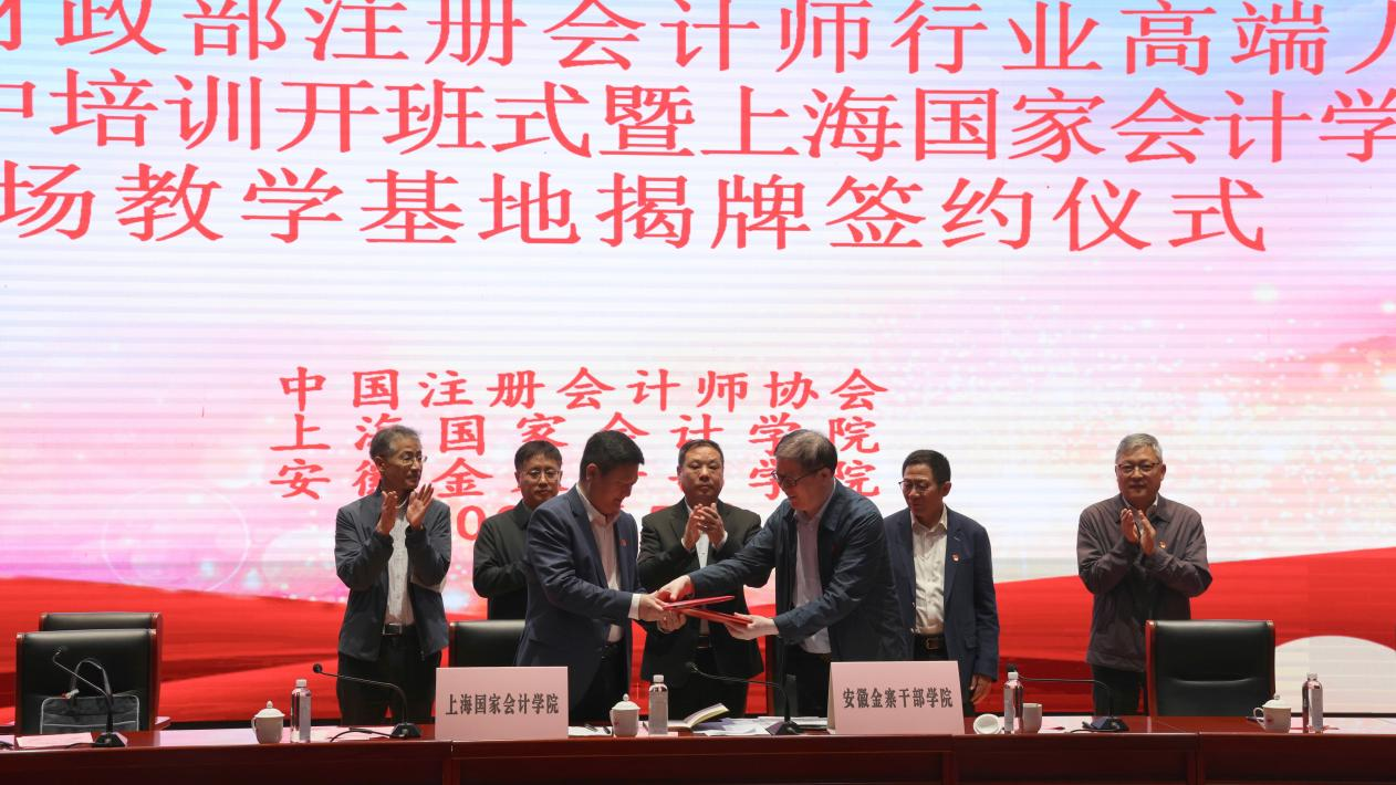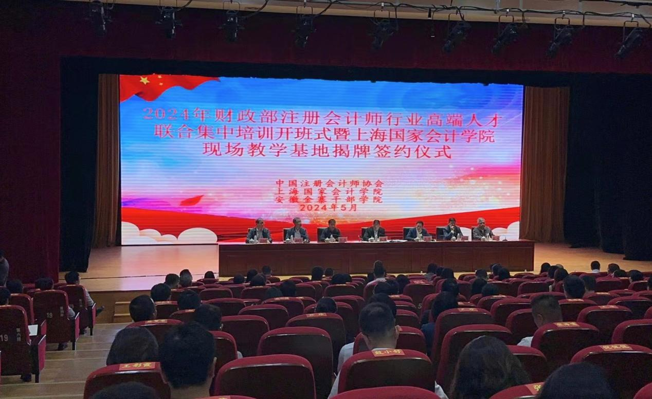 5月13日上午,2024年财政部注册会计师行业高端人才联合集中培训开班式暨上海国家会计学院现场教学基地揭牌签约仪式在安徽金寨干部学院(中共金寨县委党校)举行。中国注册会计师协会党委书记、秘书长江湧,上海国家会计学院党委书记张锋,中国注册会计师协会党委委员、副秘书长唐建华,上海国家会计学院党委委员、副院长张各兴,安徽省财政厅党组成员、副厅长张丰,六安市委常委、金寨县委书记汪冬,金寨县委常委、常务副县长汪洪涛出席仪式。