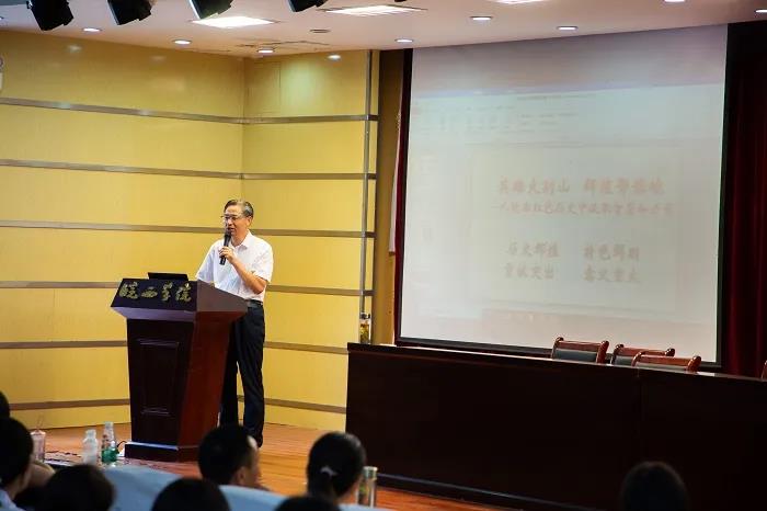 课堂上,胡遵远首先从历史辉煌、特色鲜明、贡献突出、意义重大四个方面阐述在波澜壮阔、烽火连天的峥嵘岁月里,以金寨人民为代表的皖西人民用鲜血和生命创造了28年红旗不倒的伟大奇迹,铸就了大别山精神。胡遵远强调,皖西是中国革命的重要策源地,人民军队的重要发源地,是当时鄂豫皖三省的中心区域。皖西“五早”,即马克思主义传播早、党的组织诞生早、革命武装起义早、红军队伍建立早、革命根据地形成早。围绕皖西是中国革命的重要策源地,胡遵远向大家重点讲述了金寨县的革命历史,从笔架山上成立第一个党支部,到立夏节起义、六霍起义,再到鄂豫皖革命根据地的正式形成,每一个历史事件都振奋着人们的精神。围绕皖西是人民军队的重要发源地,胡遵远介绍了在金寨境内组建的12支主力红军队伍,金寨是红四方面军、红25军的主要发源地。胡遵远以其丰富的知识,向大家讲述一支支红军队伍的传奇色彩与英雄故事,每一个红色故事都激励着人们的心灵。