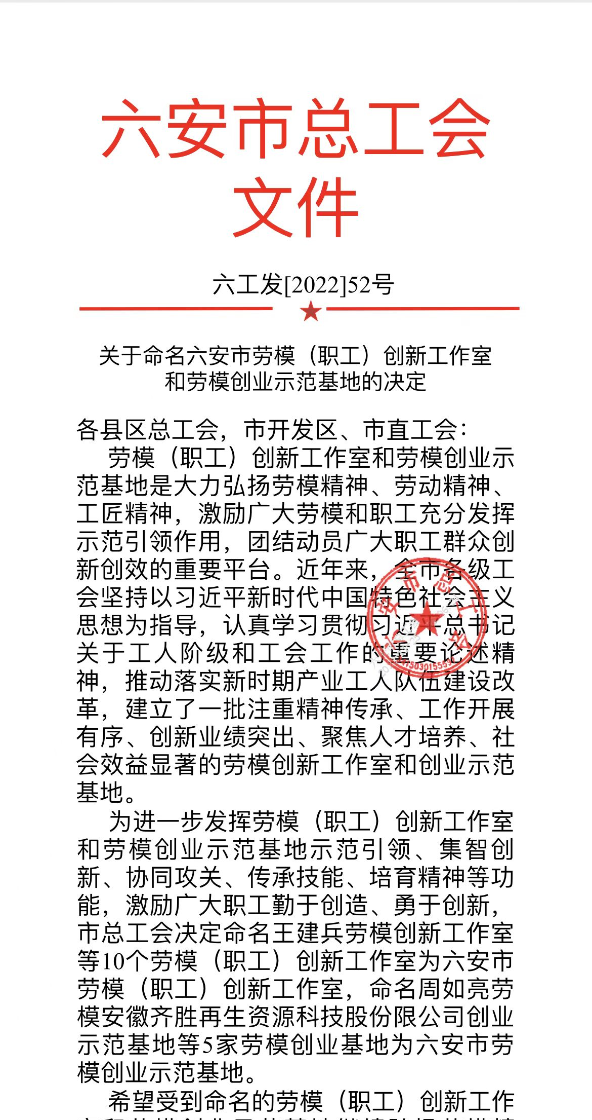 为进一步弘扬劳模精神、劳动精神、工匠精神,激励广大劳模和职工充分发挥示范引领作用,近日,六安市总工会经综合评定,命名10个劳模(职工)创新工作室为六安市劳模(职工)创新工作室,我院申报的“周宇劳模创新工作室”成功获批。